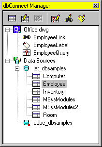 The dbConnect Manager is a dockable, resizable window that contains a set of buttons and a tree view. In the dbConnect Manager, you can open the Data View window to view or edit a database table. You can also associate various database objects (such as link templates, label templates, and queries) with an AutoCAD drawing.