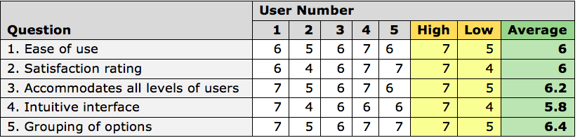 In the usability test, users were asked to perform two tasks using the existing legacy UI and the new UI. Users were also presented with a questionnaire that asked them to rate the two UI’s. Users rated the software on a variety of measures, responding with a number ranging from 1 to 7. A low numerical rating indicated a negative impression on a given measure, while a high numerical rating indicated a positive impression.